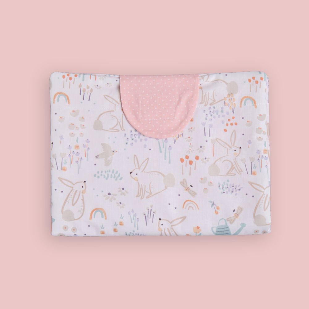 Il nostro porta pannolini è composto da due tasche, una con il buco per le salviette e una per i pannolini, chiusura con velcro.